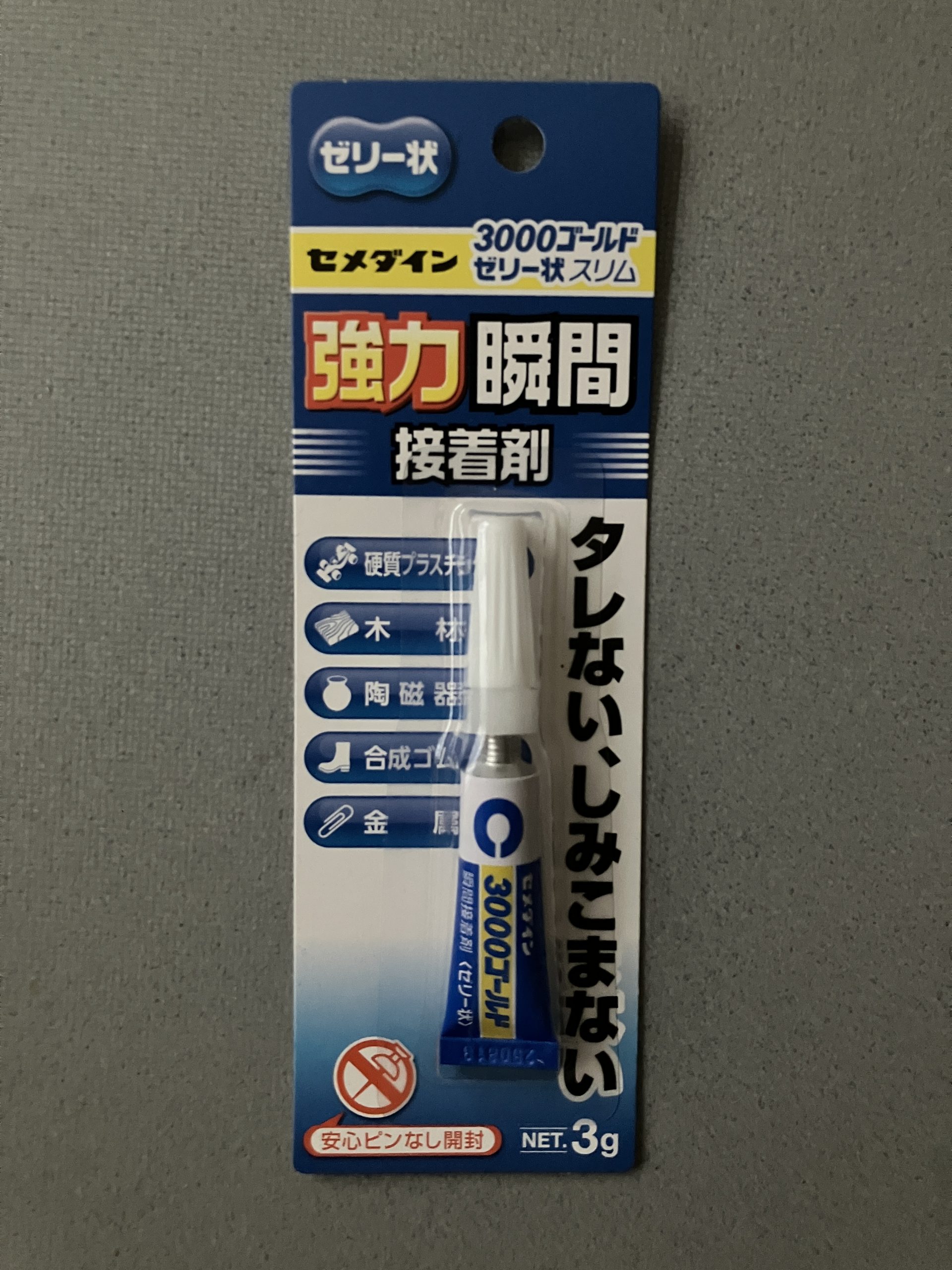 ①補修布はすでにあるので、②瞬間接着剤を購入するにあたって、丁度、100均に老舗のセメダイン製で少量、ゼリー状タイプの商品が売っているのを発見、近所のセリアで購入しました。